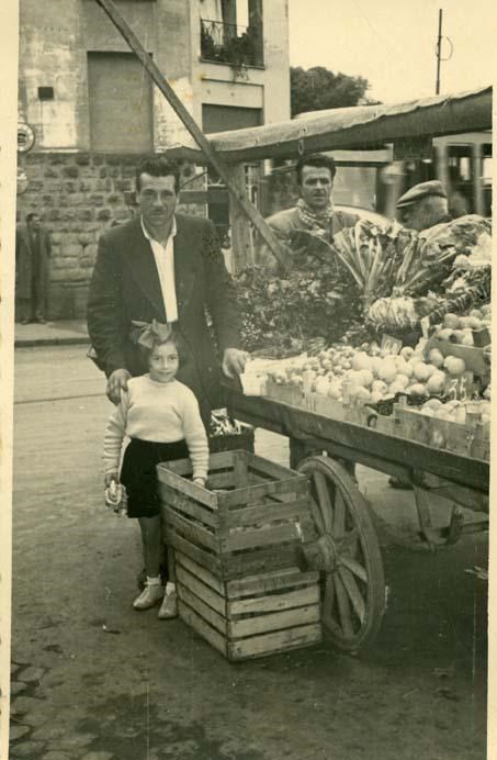Aldo, Piccinelli con il signor Augusto accanto ad un banco di ortaggi in Piazza Michele da Carbonara - zona Garbatella