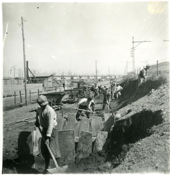 Cantiere del Ponte di Mezzocammino: gli operai scavano e caricano con i badili i carrelli per il trasporto della terra