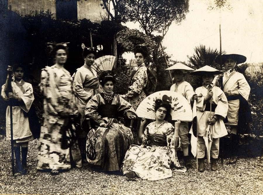 Cinque donne e quattro bambini della famiglia Josi, mascherati in costumi orientali nella Vigna di famiglia, nei pressi dell'attuale Piazza Carpegna