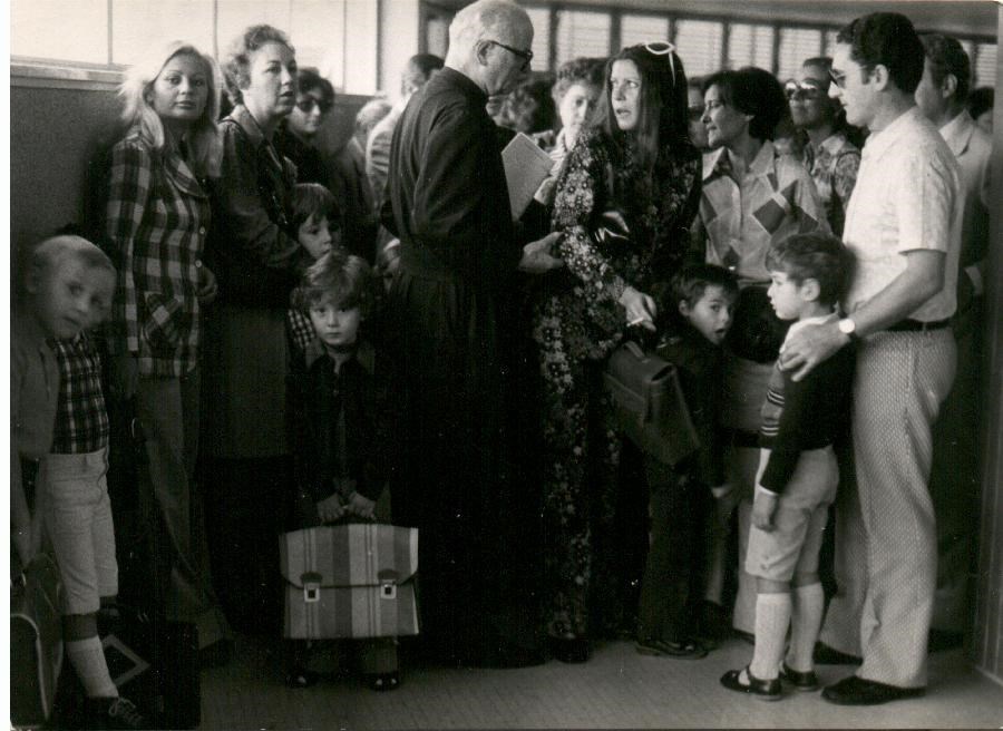 David Secchiaroli al suo primo giorno di scuola al "M. Massimi", in una piccola folla di genitori e bambini