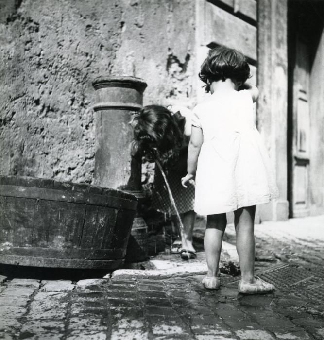 Due bambine alla fontanella di via dei Riari; nel portone vi era un esercizio di vini e olii.