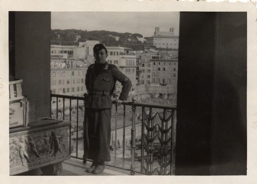 Enrico Campos Venuti alla finestra della propria abitazione sul Lungotevere. Il palazzo venne demolito per la ricollocazione dell'Ara Pacis