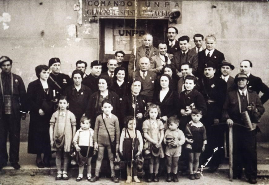 Esercitazione con maschere antigas davanti alla sede dell'Unione Nazionale Protezione Antiaerea, organizzazione volontaria nata nel 1936