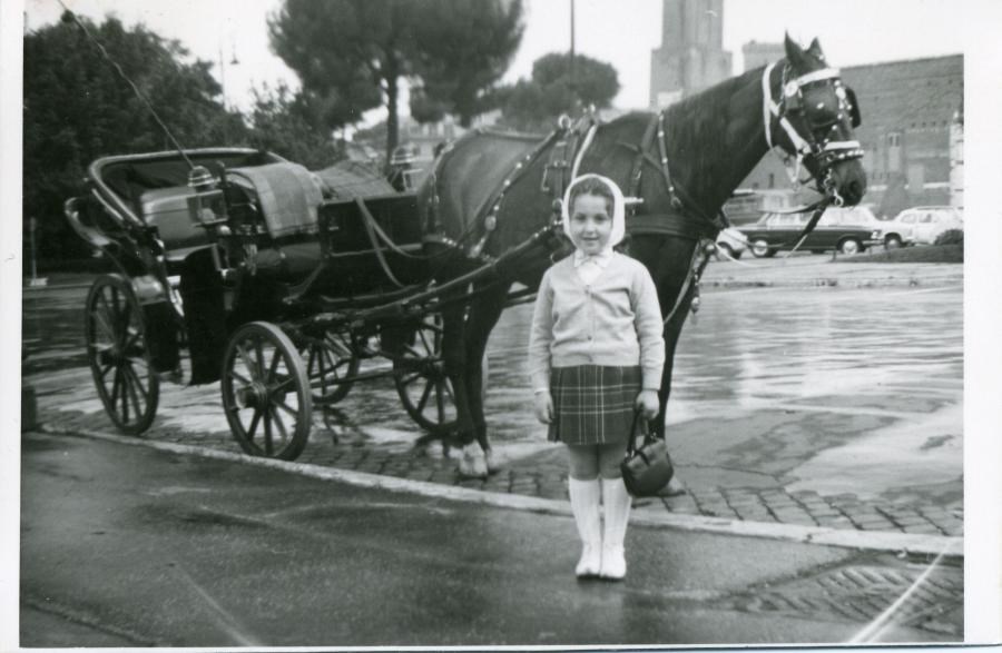 Floriana Pontecorvo davanti ad una carrozzella in via dei Fori Imperiali