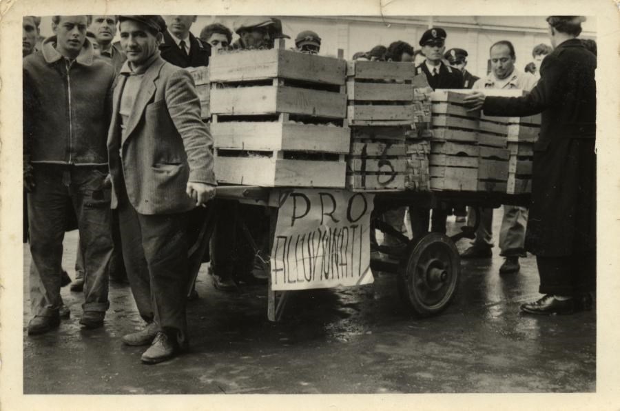 Fulvio Del Monte, presidente della cooperativa pesatori, trascina un carretto della raccolta per gli alluvionati del Polesine nei Mercati Generali