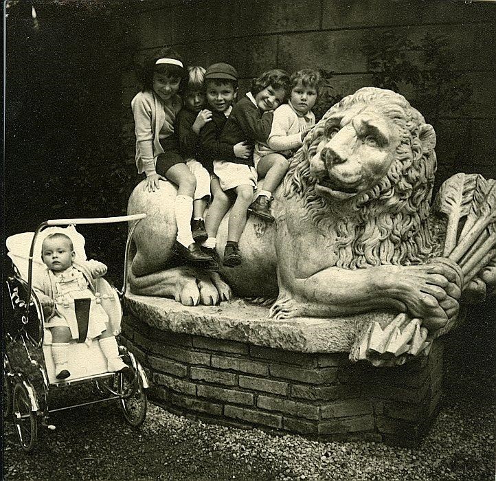 Giardino del lago di Villa Borghese: cinque bambini seduti sulla scultura del leone con frecce tra gli artigli, accanto a un altro bambino in carrozzina
