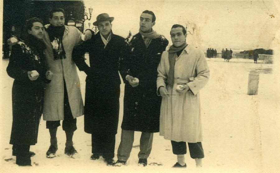 Giorgio Antonelli (il primo da destra) con il fratello Bernardo (il secondo da sinistra) e gli amici, durante la nevicata del '45 al Pincio