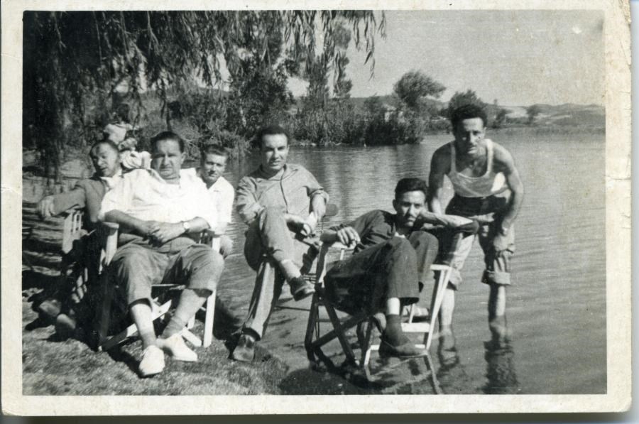Gita con gli amici del Cral Romana Gas al lago di Bolsena; da sinistra Ciro, Francesco De Simoni detto "Checco", un collega, Mori, Leone Volpe detto "Umberto" e Marcello Pasini detto "Cannavota"