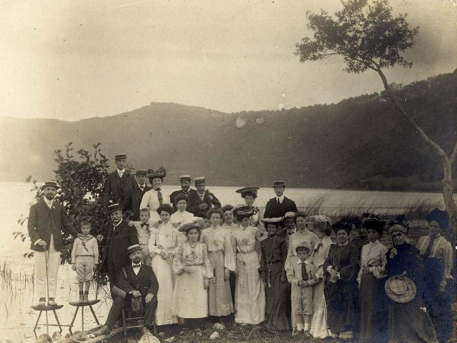 Gita sociale a Castel Gandolfo, sul lago. Un fotografo, seduto; quattro bambini, quindici donne e nove uomini in piedi, in posa fotografica; a sinistra padre e figlio su due sgabelli per non bagnarsi i piedi