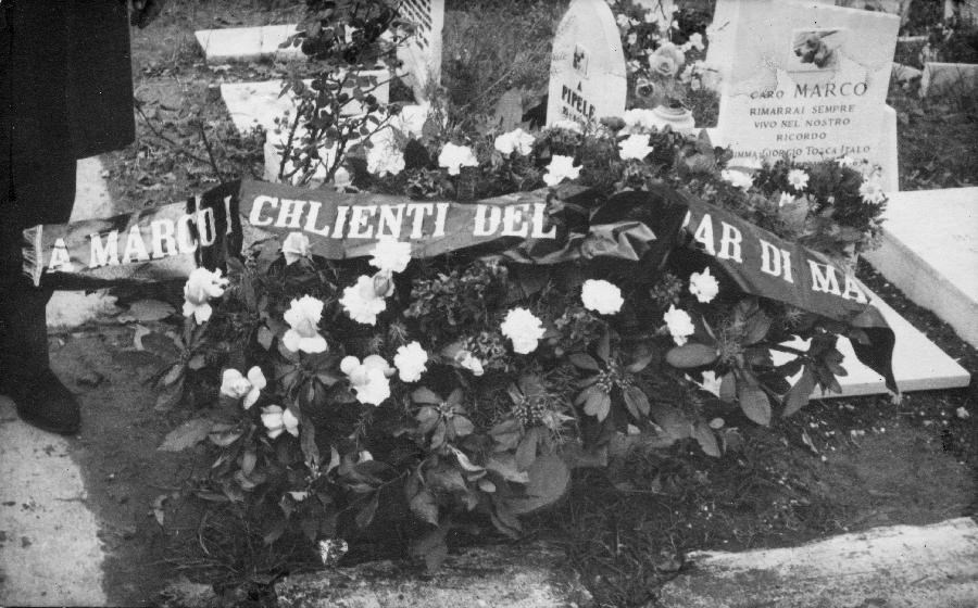 La deposizione della corona funebre per il cane Marco, donata dai clienti del bar Di Marzio