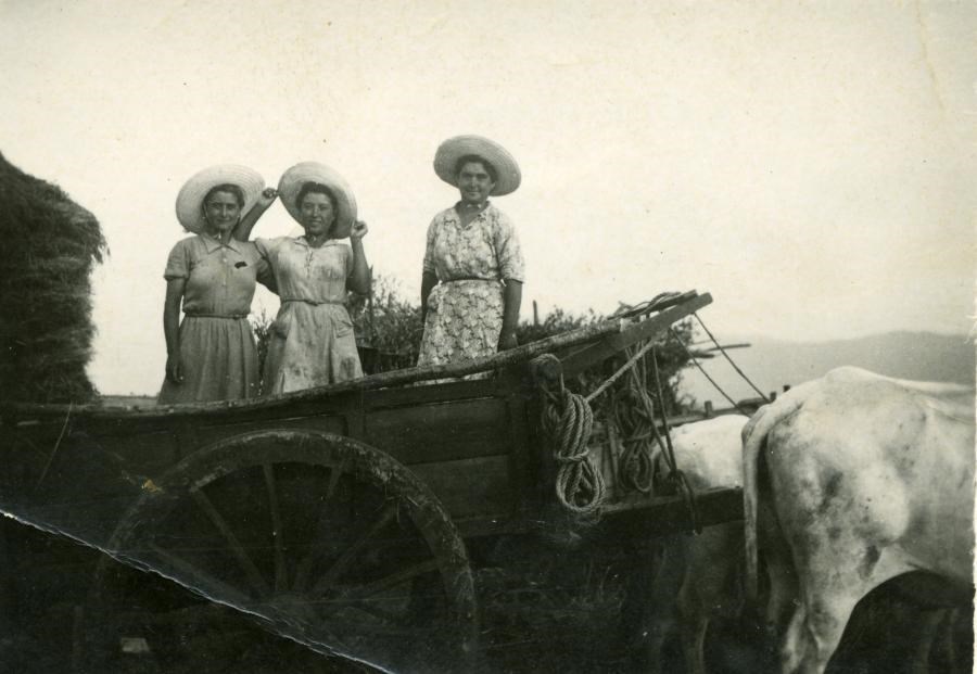 La mamma di Emanuela, Rosa Fiorini, è la prima a sinistra. In primo piano il barroccio (carro a due ruote trainato da due buoi) con cui Emanuela e le sorelle giocavano durante le vacanze estive