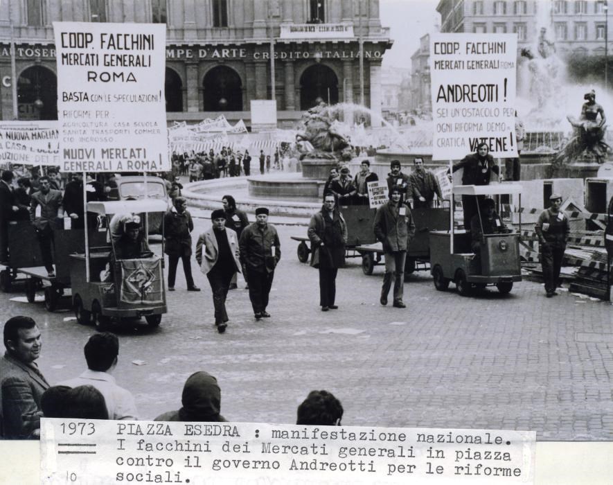 1973 Piazza Esedra: manifestazione nazionale/ i facchini dei mercati generali in piazza/ contro il governo Andreotti per le riforme/ sociali