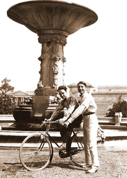 Mio padre, in piedi, con un amico a Valle Giulia davanti a una delle due fontane gemelle delle tartarughe, sulla scalinata che porta all'ingresso di Villa Borghese