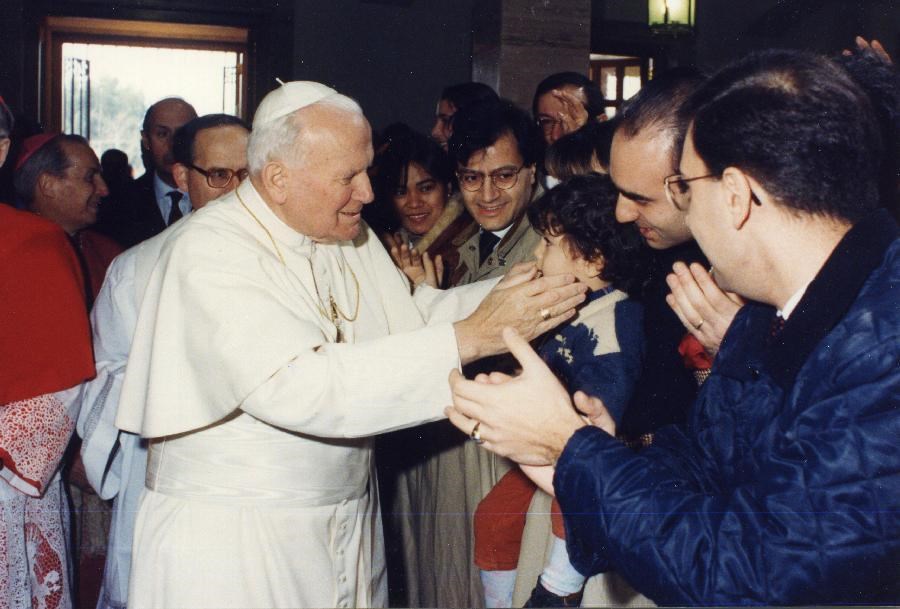 Papa Giovanni Paolo II saluta Mirko Orecchia in braccio al padre Fabrizio durante la solenne dedicazione della Chiesa parrocchiale Beato Josemaría Escrivá
