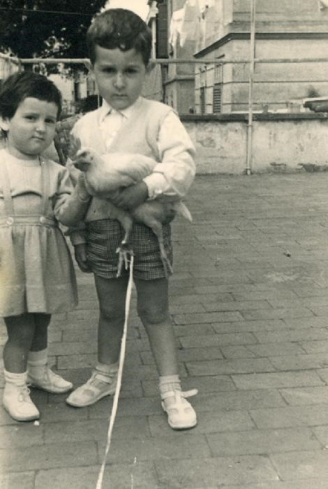 Riccardo Aleandri con sua sorella Maria Paola sul terrazzo della casa di via Acqui ed un pollo, loro compagno di giochi