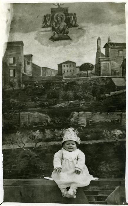 Ritratto di Luisa Zambrini con il fondale del Santuario della Madonna del Divino Amore