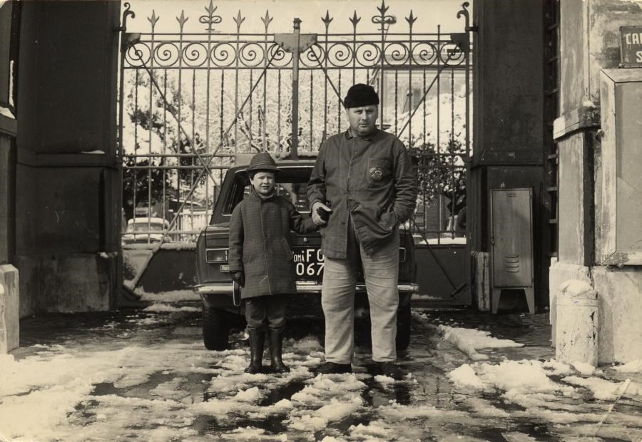 Silvano Di Lino con il figlio al cancello dei Mercati Generali dopo una nevicata