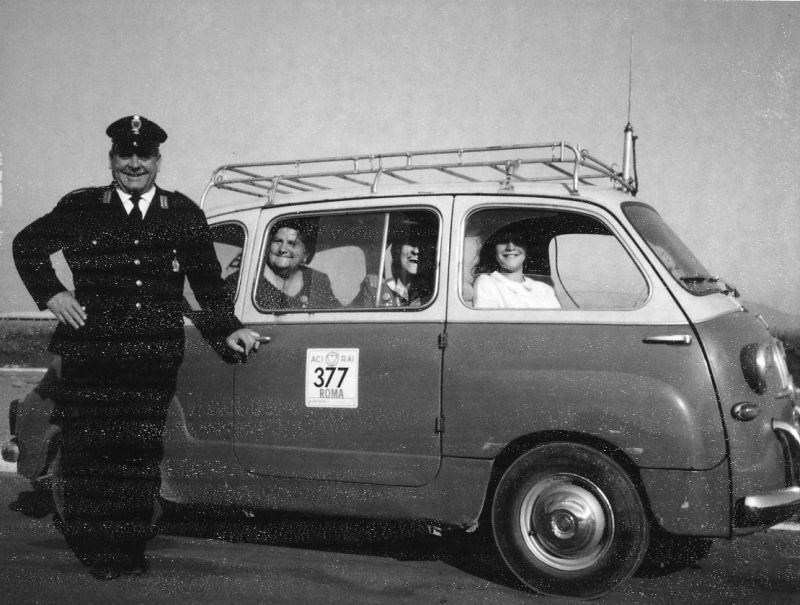 Un vigile posa vicino ad una fiat 600 multipla in occasione di una sfilata di automobili.