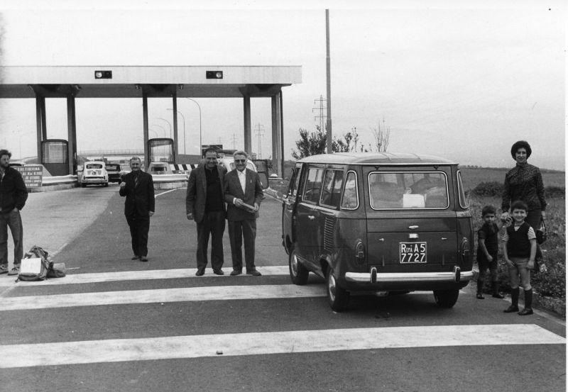 Urbano Citti e famiglia con la loro fiat 850 pulmino, in occasione dell'apertura della nuova Autostrada del Sole il 15 settembre 1967.