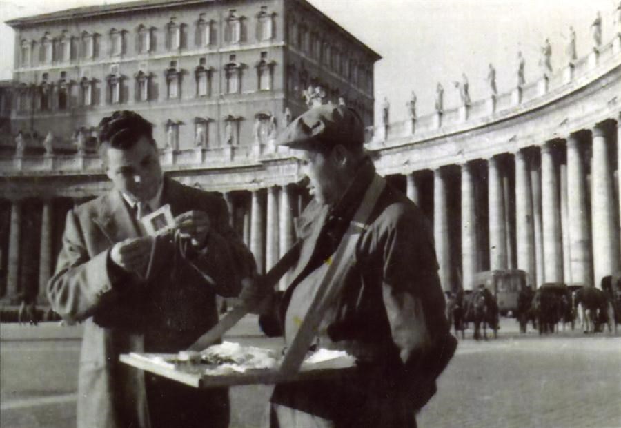 Urtista a Piazza san Pietro, con l'espositore dei souvenir