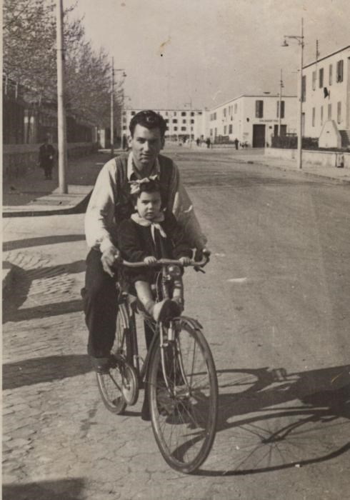 Via Federico Borromeo (quartiere Primavalle). Michele Grana in bicicletta con la nipotina