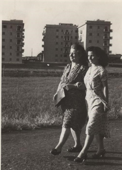 Via Pasquale II (quartiere Primavalle). Giorgina Ghilardi, figlia dello scrittore Giggi Ghilardi, con la mamma Margherita Napoleoni durante una "passeggiata al vento".