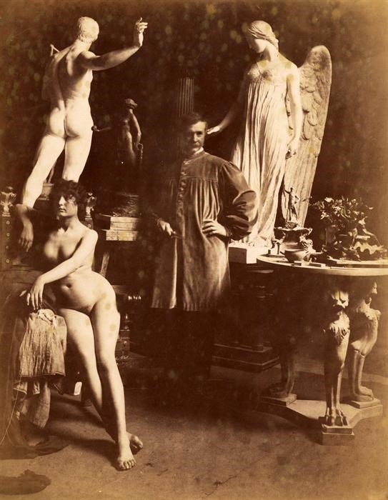 Lo scultore Adolfo Apolloni (1855 – 1923) è ritratto al centro del suo studio di via Margutta, dove una modella si confonde con le sculture.