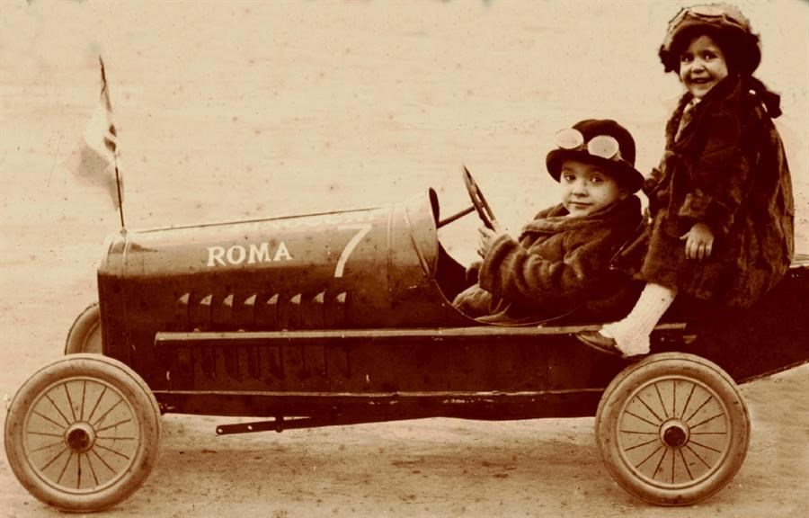 Dai tricicli alle auto a pedale, alle automobili giocattolo, sino a improbabili mezzi fai-da-te di locomozione, emergono dal passato i simboli di un'educazione dei figli basata sui miti del progresso e della velocità. Più tardi gli adolescenti proveranno carretti o carrozzine autocostruite su discese impegnative, con tavole trasformate in bolidi, freni d’occasione e cuscinetti a sfera per le ruote.